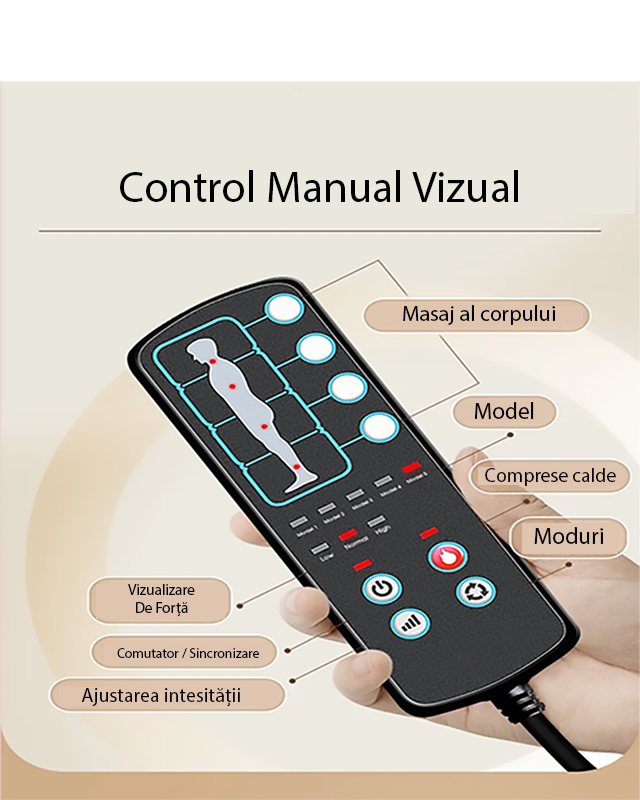 Acest produs este echipat cu o telecomanda intuitiva, care permite utilizatorilor sa aleaga intre diferite moduri de masaj si sa regleze intensitatea masajului. Aceasta poate fi utilizata pentru a selecta intre functiile de masaj cu framantare, vibratii si incalzire sau pentru a personaliza experienta de masaj.